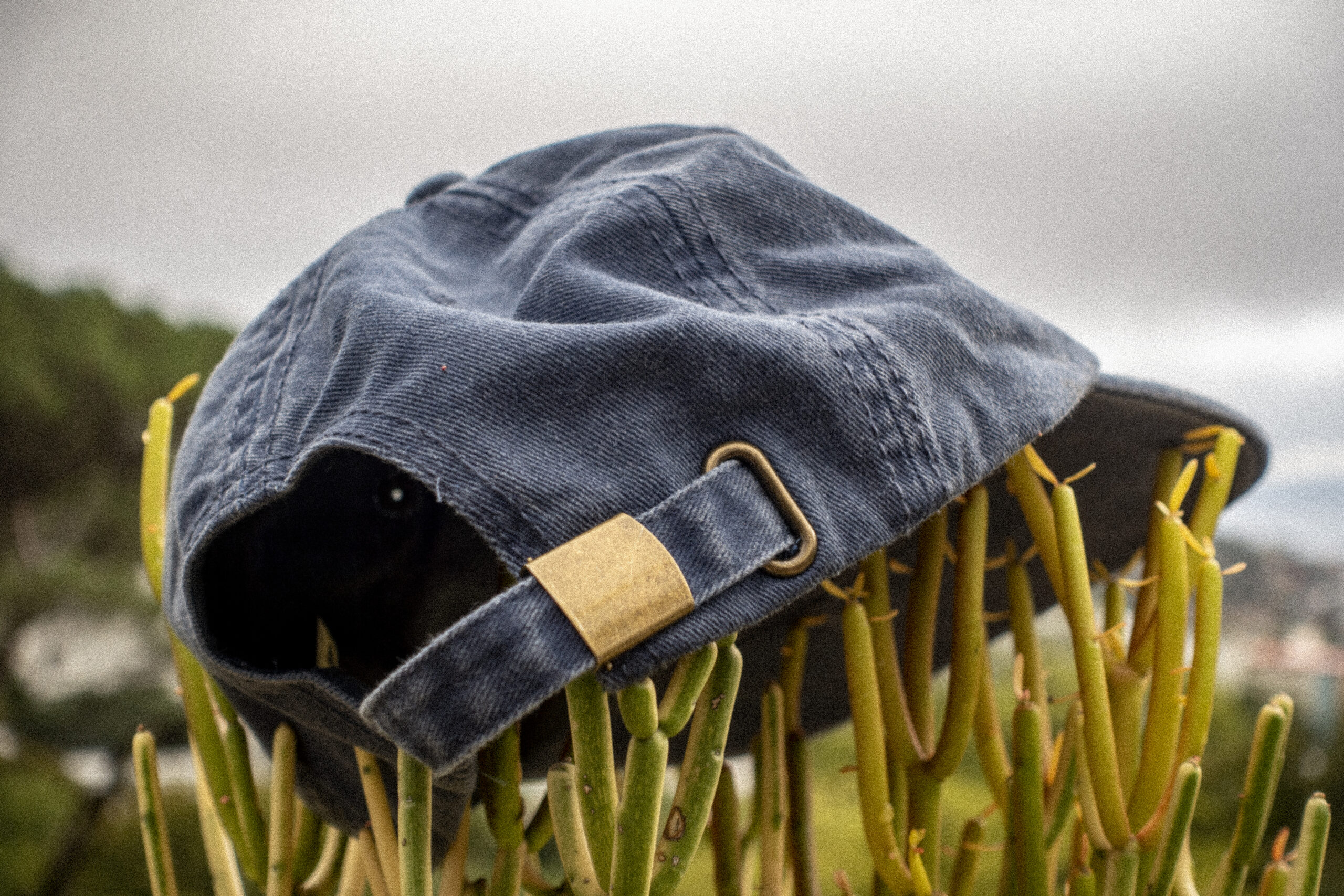 Benaaide fokken 3D embroidery on a kak cool 100% cotton faded navy fokken dad cap with a benaaide brass clasp at the back.