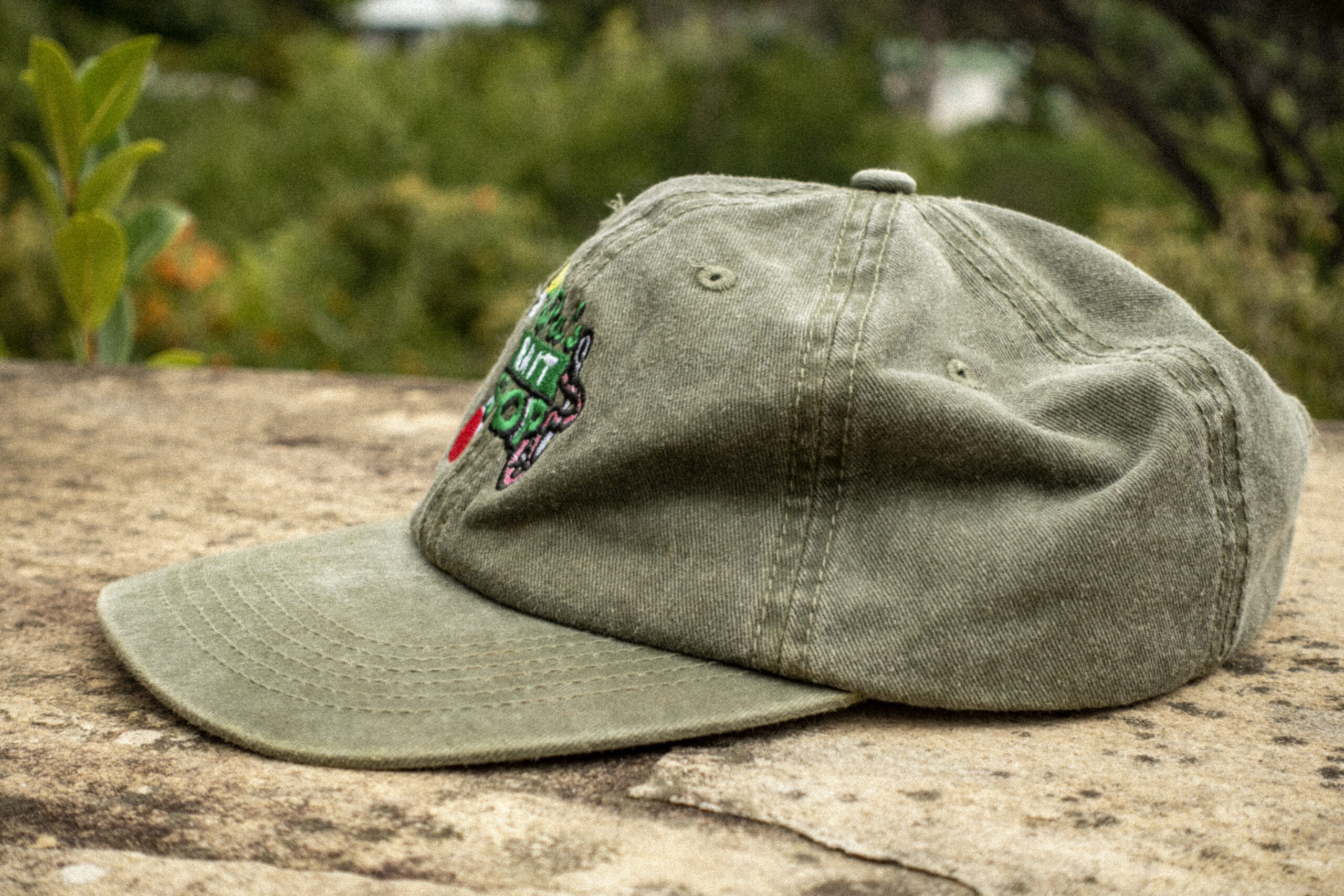 Benaaide embroidery on a kak cool 100% cotton faded olive green fokken dad cap with a benaaide brass clasp at the back.