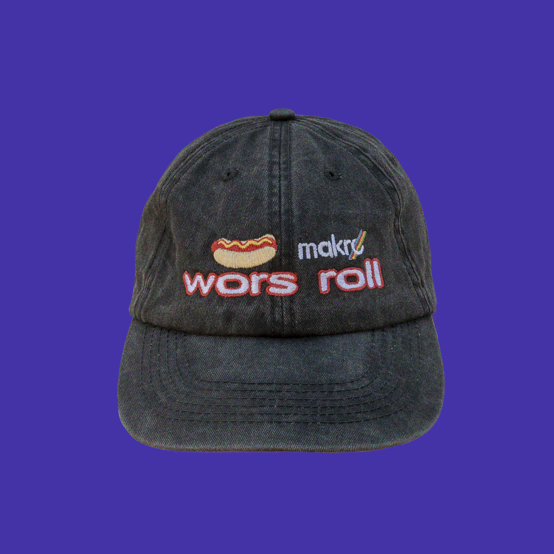 Makro fokken Wors Roll embroidered onto a kak djas 100% cotton faded black fokken dad cap with a benaaide brass clasp at the back.
